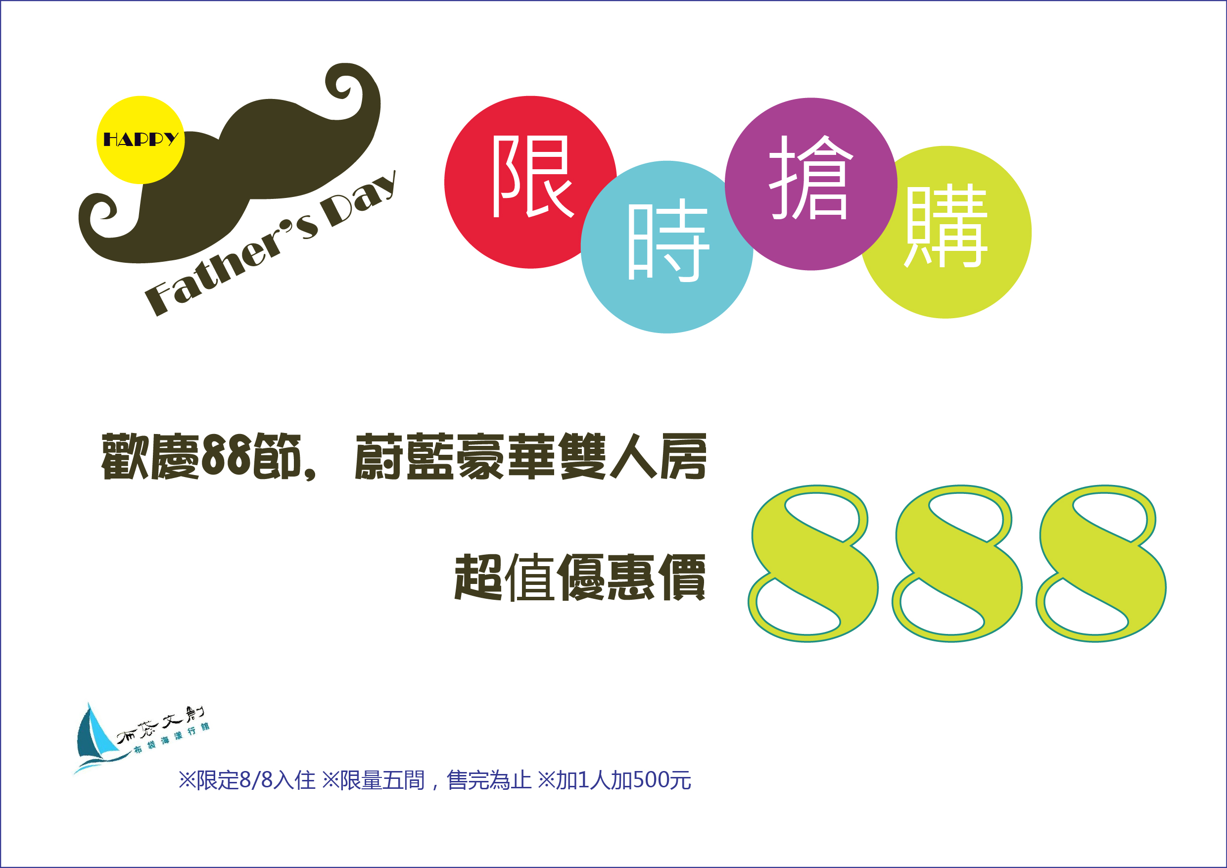 感謝爸爸一年的辛勞,特地推出蔚藍豪華雙人房超殺優惠專案,只要888元就可以入住唷~~數量有限,售完為止想預訂的朋友趕快來電訂房唷~05-3476788